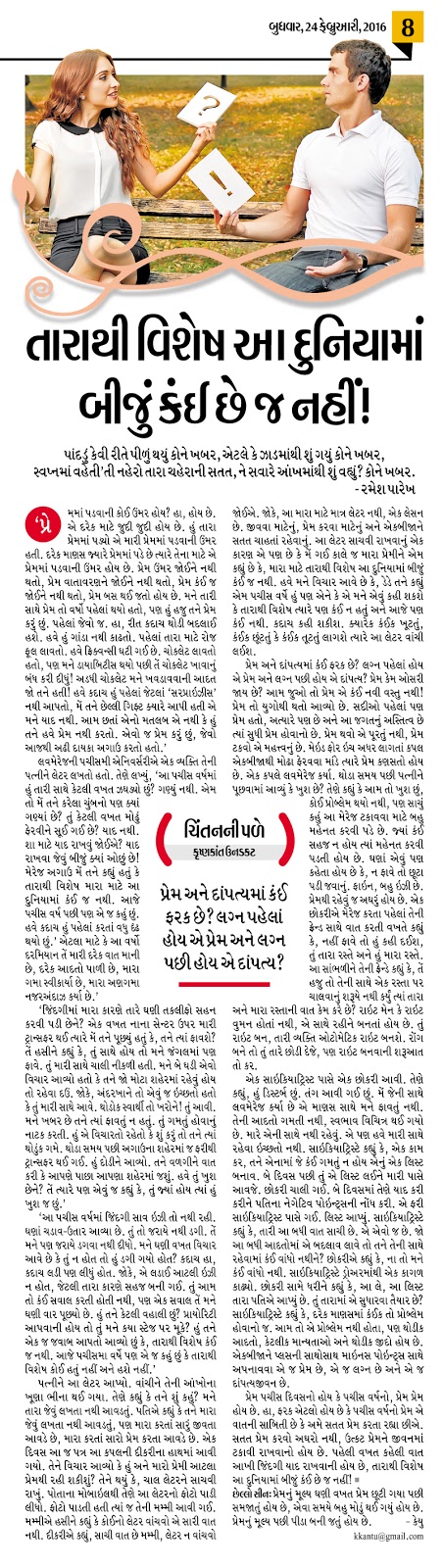 પત્નીને આ લેટર આપ્યો. વાંચીને તેની આંખોના ખૂણા ભીના થઈ ગયા. તેણે કહ્યું કે તને શું કહું? મને તારા જેવું લખતા નથી આવડતું. પતિએ કહ્યું કે તને મારા જેવું લખતા નથી આવડતું, પણ મારા કરતાં સારું જીવતા આવડે છે, મારા કરતાં સારો પ્રેમ કરતા આવડે છે. એક દિવસ આ જ પત્ર આ કપલની દીકરીના હાથમાં આવી ગયો. તેને વિચાર આવ્યો કે હું અને મારાે પ્રેમી આટલા પ્રેમથી